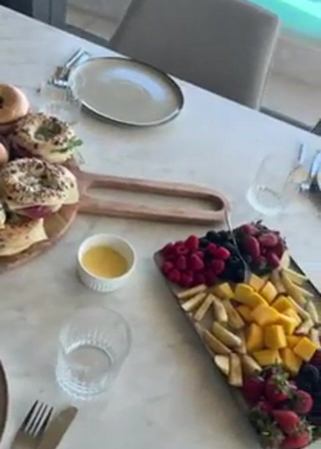 The video displays a breakfast table set outdoors. There are plates, cutlery, and glasses for several people. The breakfast includes a wooden tray holding bagels with various fillings, and a bowl of hard-boiled eggs. Another tray holds a colorful assortment of fruit, including raspberries, strawberries, blackberries, sliced mango, and sliced pears. There is a small white dish containing a yellow liquid, possibly honey or syrup. A vase filled with white roses and baby's breath serves as a centerpiece. In the background, an infinity pool is visible, with a clear blue body of water and a white patio area.