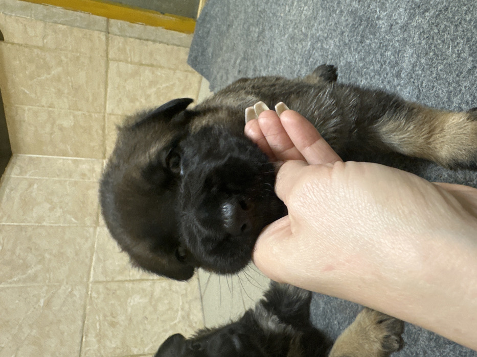 A very young, black and tan German Shepherd puppy is lying down on a grey surface. A hand with long, manicured nails is gently touching the puppy's face. The puppy is mostly dark, but has tan coloring on its paws. In the background are tiled walls and floors. Another puppy is seen laying under the first.