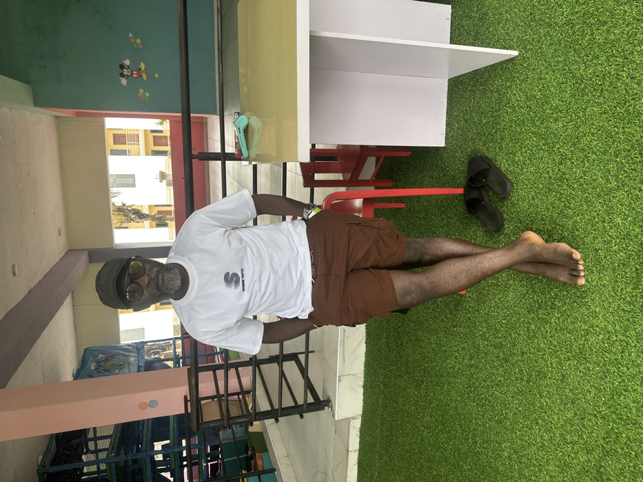 A middle-aged man stands barefoot on green artificial turf in an open-air covered area in Mopo Onijebu, Nigeria
