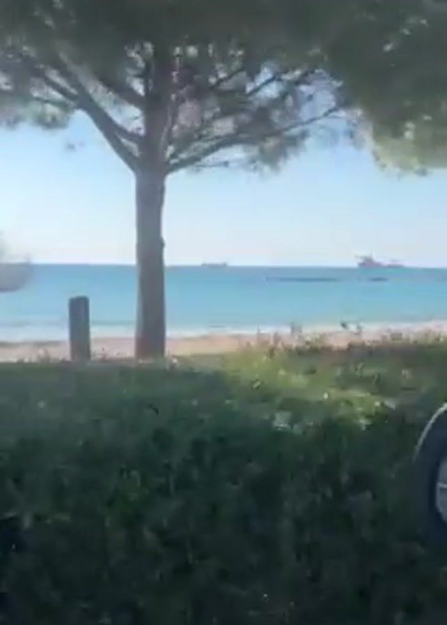From inside a moving vehicle, the scene is a sunny coastal view. The calm blue ocean stretches to the horizon, with a few distant ships visible. A sandy beach lines the coast, bordered by a green grassy area. Several trees, including a larger pine, stand between the road and the beach. A few people are visible on the beach. A trash receptacle stands near the larger tree.