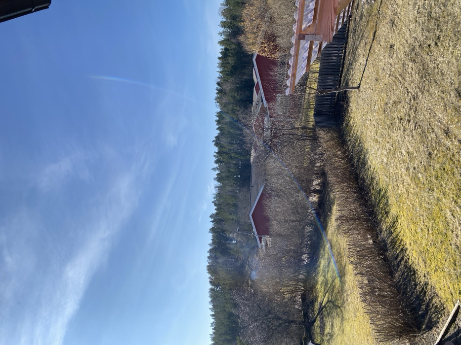 The image displays an outdoor, elevated view of a residential area bordering a forest in Björklinge, Sweden, under a clear blue sky with some wispy white clouds. A distinct rainbow-spectrum lens flare extends diagonally from the upper right toward the lower-center, indicating direct sunlight. A dense line of dark green coniferous trees forms the background. In the midground, several red-painted houses with light-colored roofs are visible, partially obscured by bare deciduous trees and dormant shrubs. A faint plume of white smoke rises from behind the leftmost visible house. The foreground consists of a yellow-brown grassy area, bisected by a low, bare, pruned hedge. A segment of a dark wooden fence and a light-colored wooden structure with a translucent corrugated roof are visible on the right. No individuals are present in the scene.