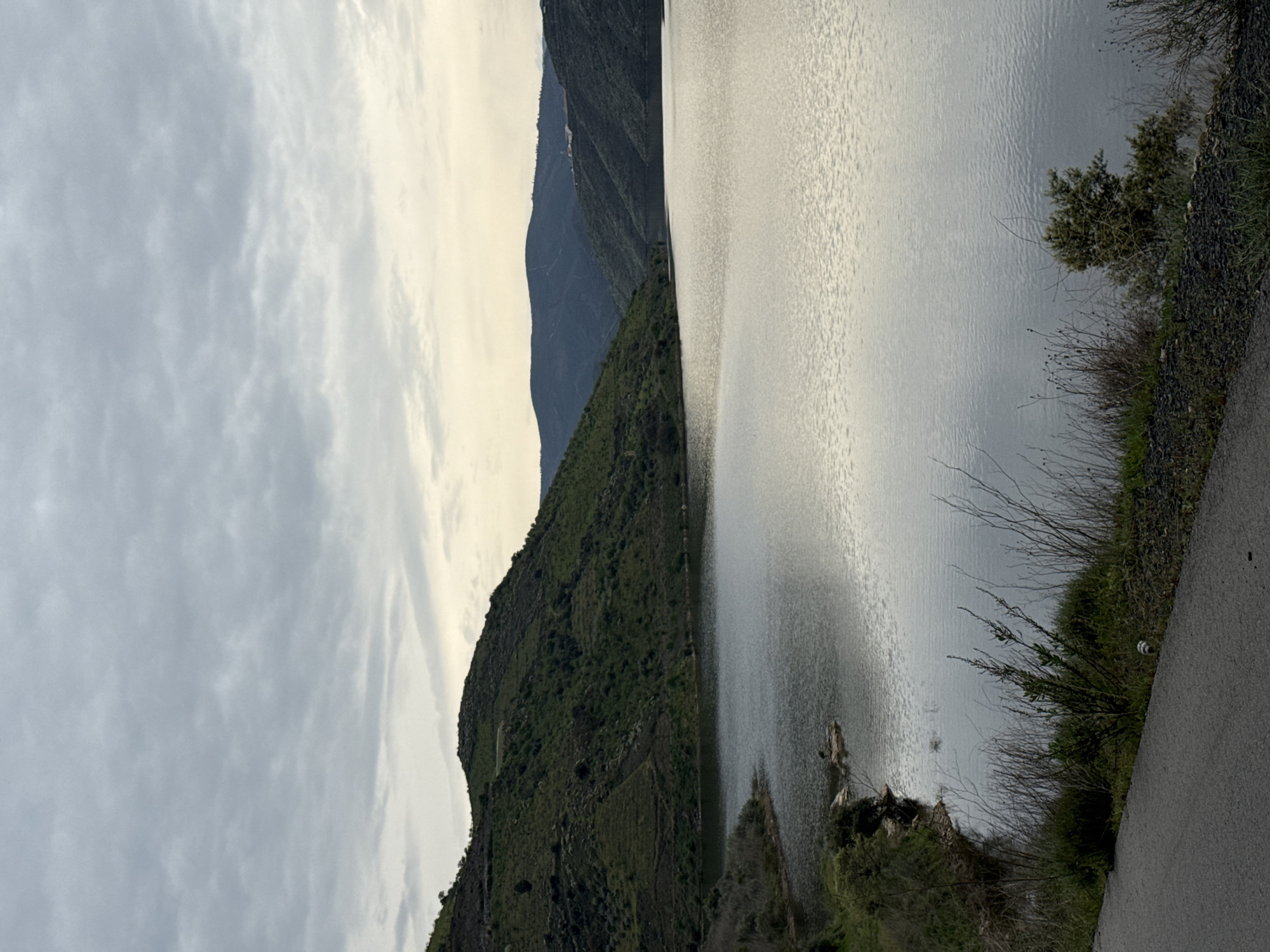 The image displays a panoramic landscape featuring a large body of water, likely a river or reservoir, within the vicinity of Mogadouro, Portugal. The perspective is from an elevated position, overlooking the water with landforms on both sides. The sky is uniformly overcast with a layer of grey stratus clouds, showing a lighter, yellowish-white gradient towards the distant horizon. The water surface is dark grey, calm, and exhibits minor ripples, reflecting the muted tones of the sky. On the left side of the frame, a steep hillside, densely covered with green vegetation including shrubs and what appear to be terraced sections, slopes down to meet the water. Exposed rock formations are visible at the water's edge along this bank. Multiple layers of vegetated hills and mountains recede into the distance towards the right and center background. Distant structures, possibly buildings, are discernable on a hillside in the far right background. In the immediate foreground, a dark grey paved road or path is partially visible along the bottom-left edge. The ground bordering the road consists of dry, light-brown grasses, green shrubbery, and small rocks. A small, light-colored cylindrical object, consistent with a discarded can, is present on the ground amongst the vegetation near the road. No people or animals are visible, and no actions or interactions are depicted.
