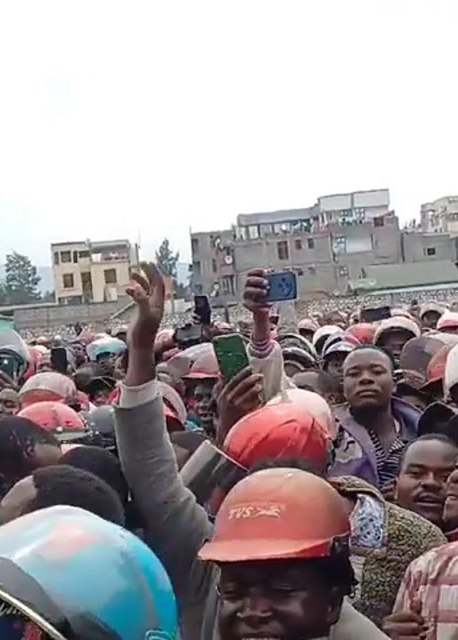 A large crowd of people is gathered in what appears to be an urban area. Many of them are wearing helmets, primarily in shades of red and black. Some individuals hold their helmets up in the air. Several people are filming or taking pictures with their smartphones. The background features buildings of varying heights and architectural styles. The sky is overcast. The crowd seems energetic and engaged, with many raising their hands.