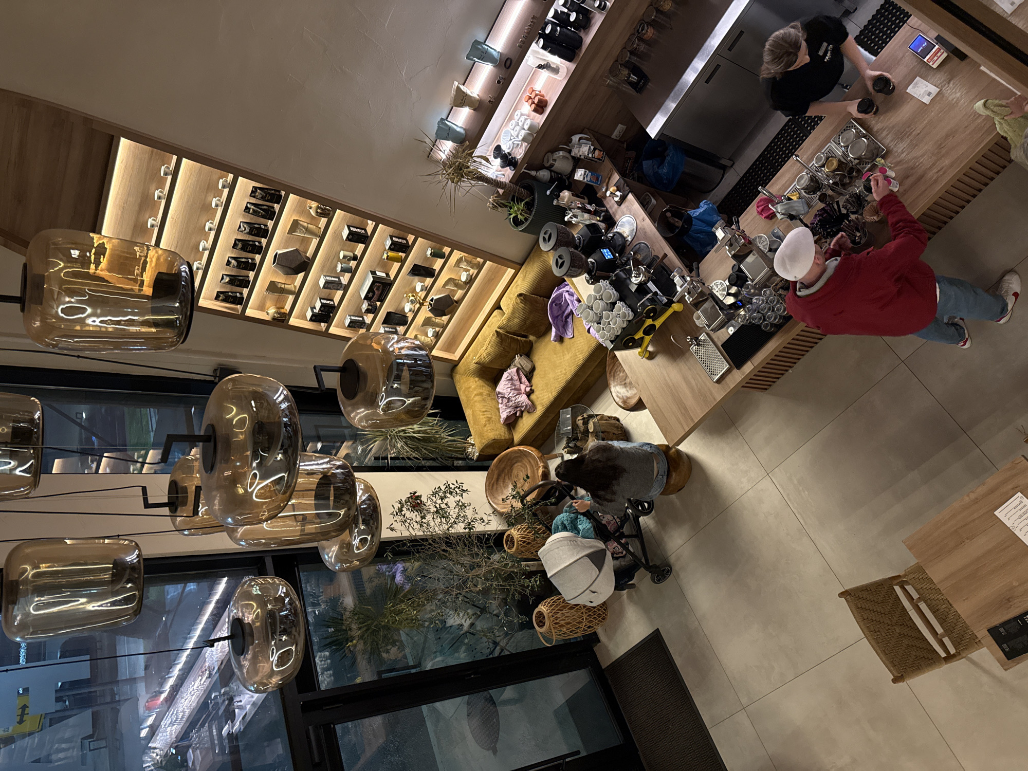 The image depicts the interior of a modern coffee shop or cafe in Podgorica, Montenegro, viewed from an elevated perspective, likely a second floor or mezzanine. The environment is illuminated by numerous amber-tinted glass pendant lights and recessed shelf lighting, suggesting an evening or night setting as indicated by the dark exterior visible through large glass windows on the left. The flooring consists of large, light-toned square tiles. On the left, a dark entry mat leads to glass doors providing access to the outside. Adjacent to the doors, a female individual with long dark hair, wearing a grey sweater and blue jeans, is seated on a small wooden stool, facing a light grey baby stroller containing an infant covered by a blue blanket. Nearby, several large potted plants and decorative wicker vases are arranged. Behind this area, a yellow corrugated sofa with cushions and a small wooden coffee table are visible. A pink jacket and purple garment are draped on the sofa. To the right, a prominent wooden shelving unit extends diagonally up a wall, featuring multiple illuminated shelves displaying various products, including small white cups, black packaged items, bottles, and decorative vases. In the lower right section of the image, a light wooden service counter (bar) runs horizontally. A professional espresso machine with two grinders and numerous white cups stacked on top is positioned on the counter. A male individual, wearing a red long-sleeved shirt, blue jeans, white sneakers, and a white flat cap, stands at the counter, facing away from the viewer, appearing to be preparing or handling items. To his right, a female barista with light brown hair, wearing a black t-shirt with a white logo, stands behind the counter, holding two black cups. A POS system/card reader and a receipt are visible on the counter surface near her. Above the counter, a shorter wooden shelf displays additional coffee-related items and products. Blue trash bags are visible under the counter. The overall scene captures a lively, contemporary cafe setting with patrons and staff engaging in typical cafe activities.