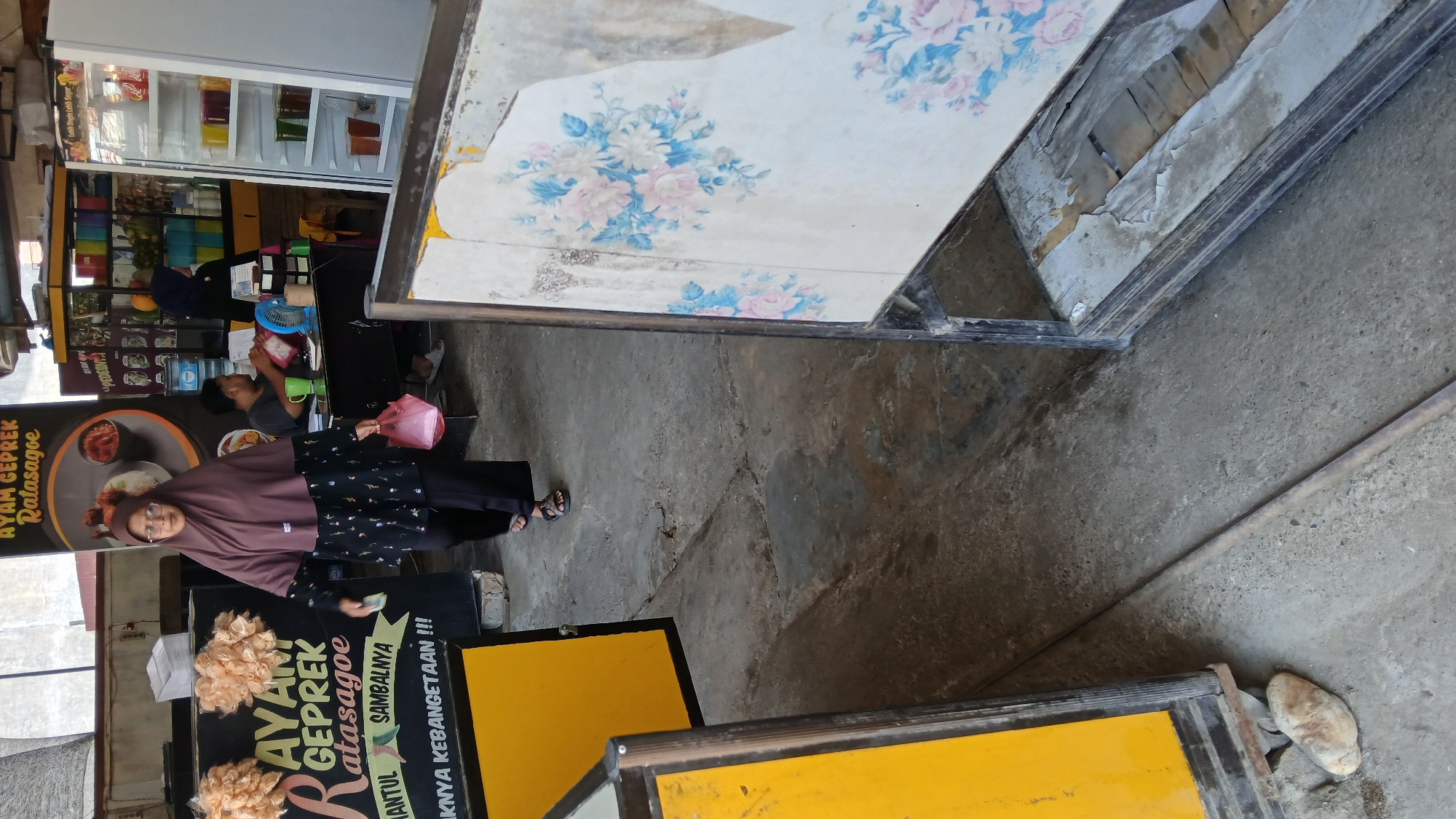 Here is a description of the image: The image shows the exterior of a food stall. A woman wearing a brown hijab, black shirt with floral patterns, and black pants stands in front of a sign for "Ayam Geprek Ratasagoe," which is a type of Indonesian fried chicken. There is a man sitting at a table in the background. Behind him is a cooler stocked with drinks. The floor is concrete. The sign is painted in black and yellow. The stall is located in the city of Lhokseumawe, Indonesia, as indicated by the food stall's name in Indonesian.