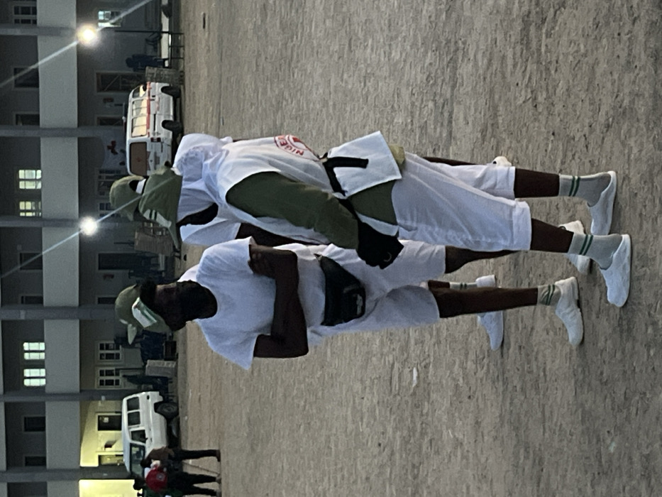 Two people in white uniforms with green caps and black belts perform push-ups outdoors. The uniforms have emblems with the word "NIGERIA". They wear white socks and shoes. The background includes a multi-story building with windows and vehicles, including what appears to be an ambulance. Other individuals stand nearby, with their appearance obscured by shadows. The ground is a beige color.