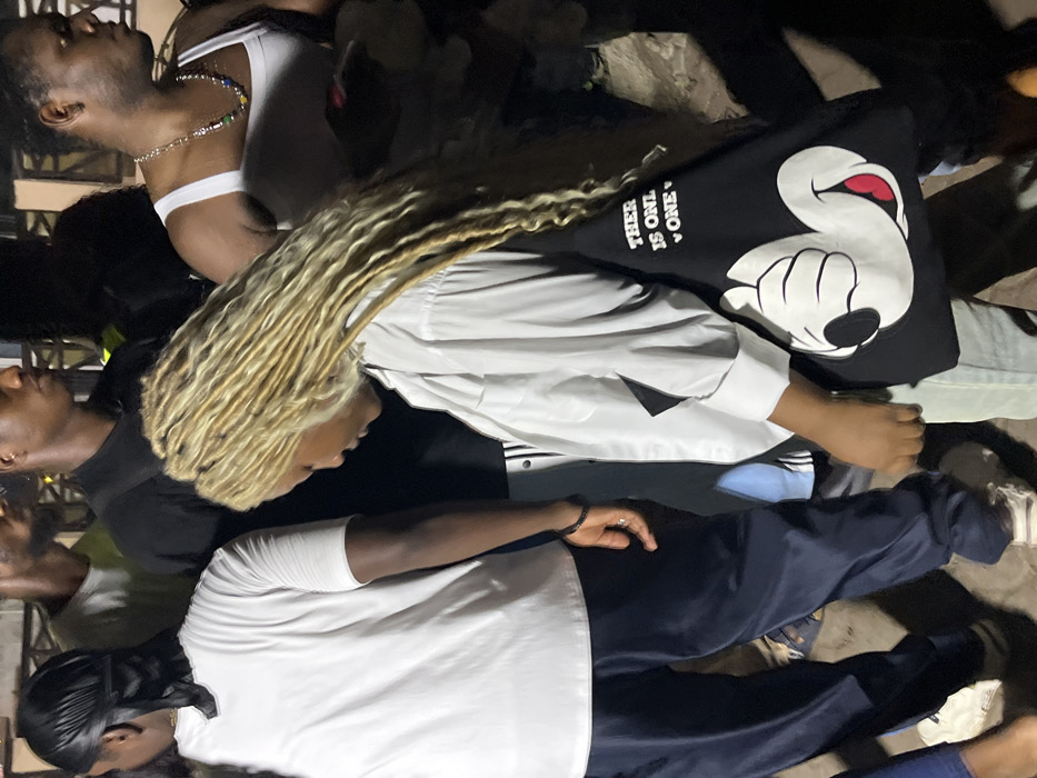 The image depicts a crowded, low-light urban scene, potentially located within the city of Accra, Ghana. A female individual with long, blonde dreadlocks is centrally featured, wearing a white collared long-sleeved shirt and light-colored jeans. She carries a black tote bag adorned with a large white graphic of Mickey Mouse's head and gloved hand, accompanied by the text "THERE IS ONLY ONE." Her head is bowed, and she appears to be looking downwards. To her immediate left, another individual is observed from behind, wearing a white short-sleeved t-shirt, dark blue athletic pants, and a dark headwrap, with a black beaded bracelet on their right wrist. Behind the central female, a third individual is partially visible, wearing a white tank top and a multicolored beaded necklace. Additional individuals are present in the background, mostly obscured by darkness, wearing various dark garments. The ground surface is dark and irregular, and background structures are indistinct due to lighting conditions. No specific actions or interactions beyond standing in proximity are discernible among the individuals.