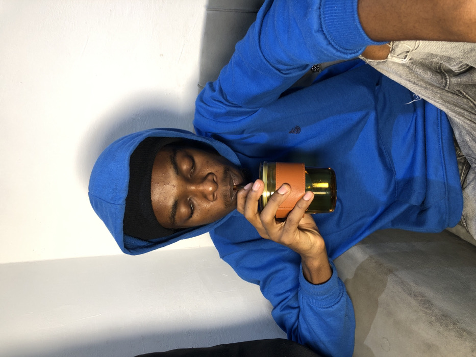 In an indoor setting within Tomefa, Ghana, a male subject is depicted seated on grey upholstered furniture. He wears a blue hooded sweatshirt with the hood up, a black beanie underneath, and light-colored ripped jeans. The subject holds an amber-tinted glass cup, fitted with a tan leather-like sleeve, in his right hand. A dark straw extends from the liquid within the cup to the subject's mouth, from which he is actively drinking, with his eyes downcast. The background consists of a plain white wall.