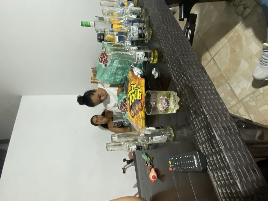 Two women sit at a table covered with empty beer bottles, a bag of chips, a glass, and a TV remote. Empty Corona beer bottles line the length of the table. One woman wears a white shirt, and the other wears a black and floral top. There is a green plastic bag on the table. The table has a dark brown, woven pattern. The room has light walls, and tile flooring is visible in the background.