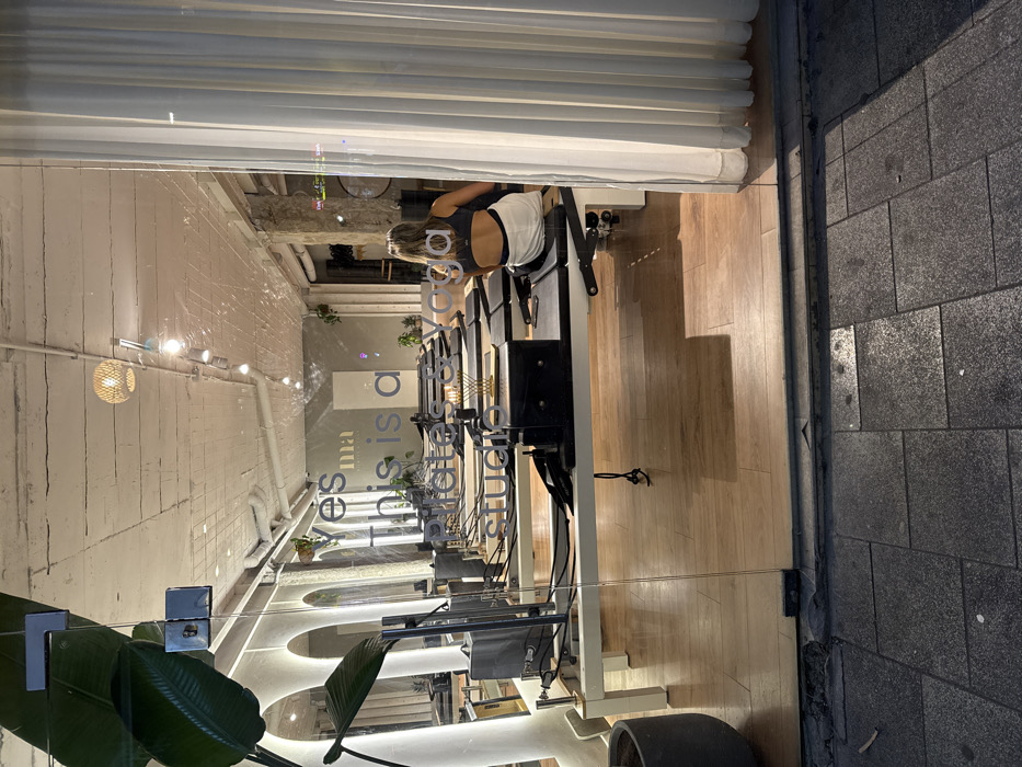 Pilates studio seen through a glass window. Inside, several reformer machines are neatly aligned. A person is using one of the machines near the window. The studio has a clean, minimalist design with a light color scheme. The exterior of the studio is visible, showing a sidewalk and a potted plant near the entrance. The words "yes ma'am pilates downtown" are written on the glass.