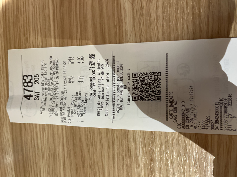 - "A white paper receipt from McDonald's Caen Centre is displayed prominently on a light brown wooden surface with distinct grain patterns" by FM-GJVN82, licensed under CC BY 4.0