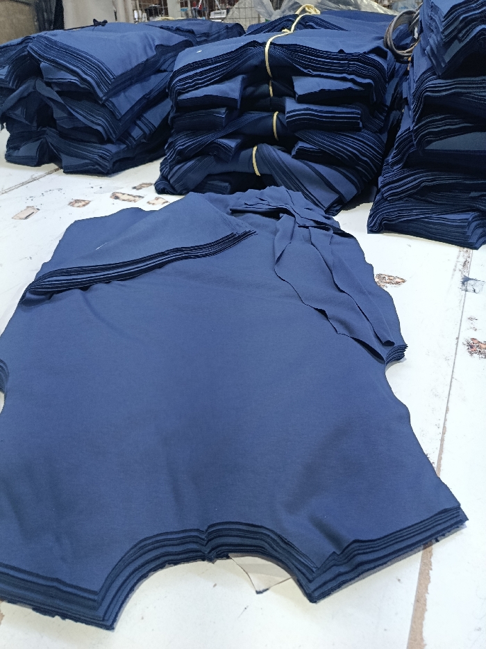 In an indoor setting within the city of Ate, Peru, multiple stacks of dark blue fabric pieces are arranged on a light-colored surface