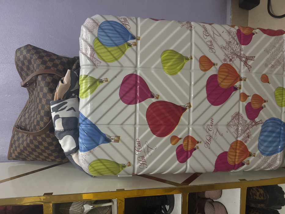 A suitcase with a patterned design of hot air balloons and Eiffel Towers is stacked next to a brown patterned tote bag. Both items are resting on a gold-trimmed shelf with compartments storing shoes. The suitcase appears to be made of a hard, shiny material, reflecting light, while the tote bag is softer. The background is a plain lavender wall.
