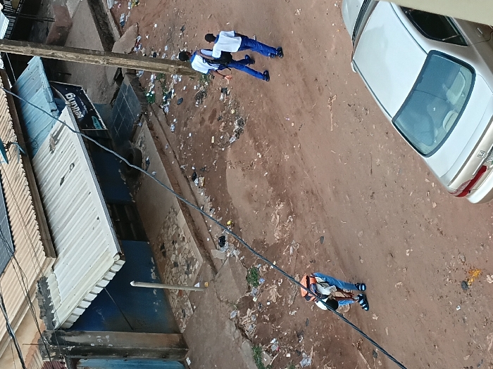 An overhead shot shows a street littered with trash. Two children in school uniforms walk near a utility pole. Power lines extend across the frame, and a man in an orange vest is seen working on the lines. A white car is parked on the right side of the street. Buildings with metal roofs and weathered facades line the left side of the frame.
