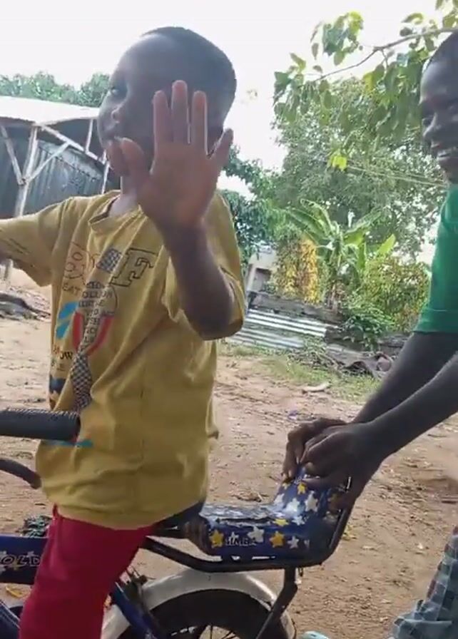 A young boy in a yellow t-shirt and red pants sits on a small blue and white bicycle outside. A taller boy or young man wearing a green t-shirt and plaid shorts helps steady the bicycle and push it slightly forward. The bicycle appears to have training wheels. The setting seems to be a yard with a dirt ground, with buildings and greenery visible in the background.