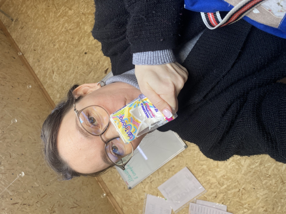 A female, likely adult, is captured in a selfie-style photograph indoors in Ol'khovskoye, Russia. She has dark brown hair, wears clear-rimmed eyeglasses, and a silver hoop earring in her visible left ear. She is dressed in a grey turtleneck beneath a black cardigan. Her left hand, featuring a French manicure, holds a packet of "Triada" brand nasal tissues, which states "10 pcs" and "Individual" in Russian. The background consists of walls and a ceiling paneled with light-colored, unpainted Oriented Strand Board (OSB). On the left wall, a white magnetic whiteboard displays partial handwritten Russian text in blue marker, and several documents in clear protective sleeves are affixed below it. Small, clear spherical ornaments are suspended by thin wires from the ceiling. A blue fabric item with a striped strap (red, white, and black) is partially visible in the lower right corner.
