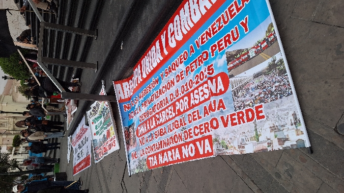 protest banner with the text: "ARMA UNIDA Y COMBATE". Further text includes: "NO MAS AGRESIÓN Y SAQUEO A VENEZUELA", "CONTRA LA PRIVATIZACIÓN DE PETRO PERU", "DEROGATORIA D.U.010-20:5", "CHANILLA A LA CARCEL POR ASESNA", "NO A ASIBA ILIGAL DEL ANA", "NO A LA CONTAMINACIÓN DE CERO VERDE" and "TIA MARIA NO VA". There's also a photograph of a large crowd marching on a highway. People are standing behind the banner on some sort of steps.