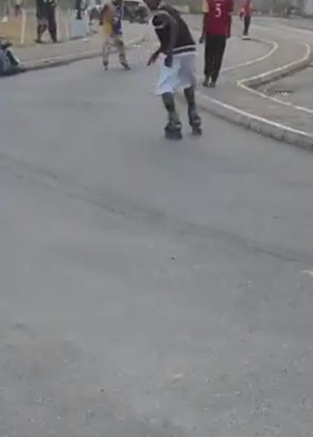 The video depicts a street scene with individuals roller skating and onlookers observing