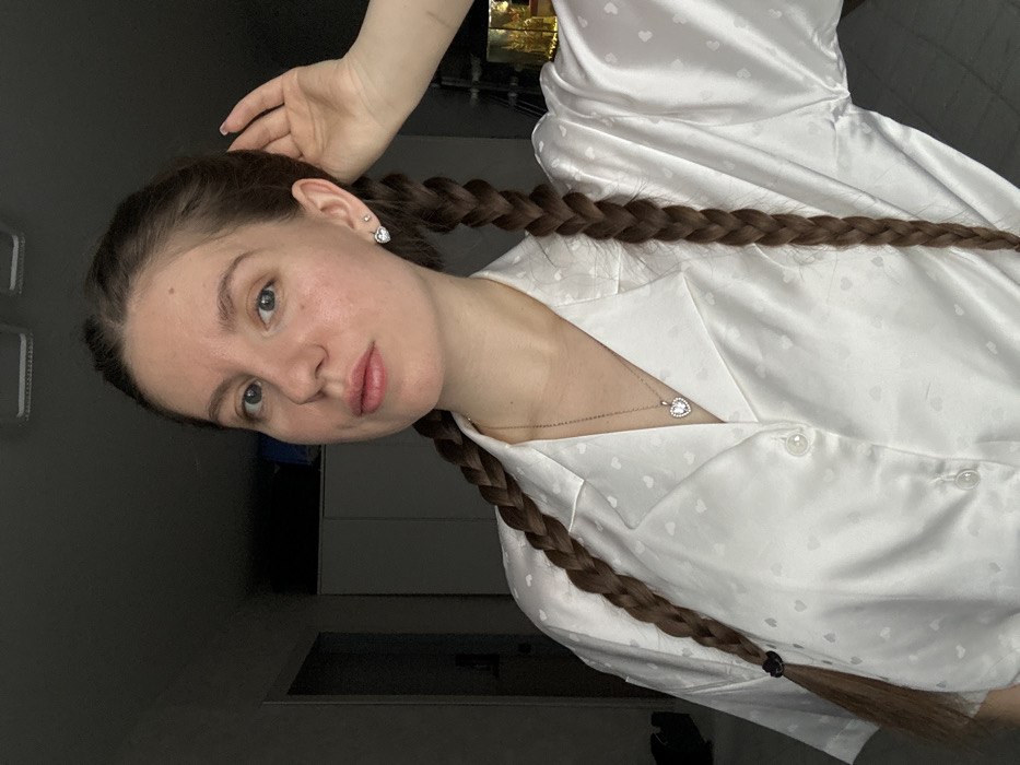 The scene depicts an adult female positioned indoors, within a room located in the city of Klin, Russia. The subject has long, light brown hair styled into two distinct braids that extend over her shoulders to approximately chest level, secured at the ends with black hair ties. She possesses a fair complexion, light-colored eyes, and pinkish lips, with no overt cosmetic enhancements visible on her face. She wears a white button-up shirt with short sleeves and a collar, featuring a subtle, embossed heart pattern woven into the fabric. Adorning her neck is a silver-toned chain necklace with a heart-shaped pendant, which contains a central clear stone surrounded by smaller clear stones. Her right earlobe displays a matching heart-shaped stud earring with a central clear stone and smaller surrounding stones, alongside a smaller, plain stud earring positioned above it. The female is looking directly at the viewer with a neutral expression. Her left hand is raised, with fingers gently touching the hair near her right temple/ear. The background is dimly lit, revealing white closet doors or cabinet panels to the left and center. Above, two square-shaped ceiling light fixtures are visible. A dark doorway or opening is partially visible further back on the left side of the frame, and a partial glimpse of a golden-colored object is seen on the far right.