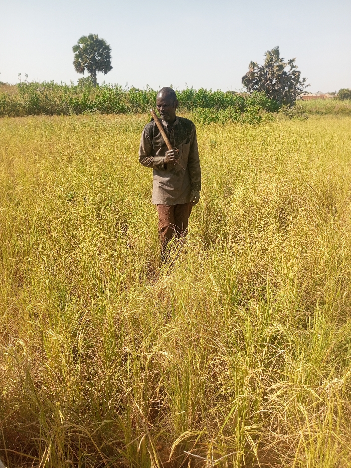 The image displays a single adult male standing in a cultivated field of mature, yellow-green cereal crops, likely rice, with visible seed heads, under a clear sky in Sabon Tasha, Nigeria