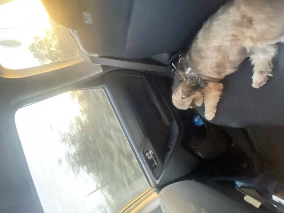 The image depicts the interior of a vehicle in Rishon LeZion, Israel, from a rear passenger perspective. A small, light brown and black dog, wearing a dark harness, is lying on the dark fabric of the rear passenger seat. The dog's head is oriented towards the left, looking slightly downwards. The rear passenger door panel, dark in color, is visible, featuring a silver door handle and power window controls. Through the rear side window, a blurred exterior landscape is visible, characterized by trees and bright, low-angle sunlight, indicative of either sunrise or sunset. The blur suggests the vehicle is in motion. A light blue, cylindrical object is partially visible on the floor or in the door pocket below the window controls. Part of the lighter-colored front passenger seat is visible on the far left. No human occupants are visible.