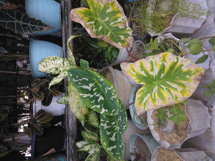The image displays a dense arrangement of potted plants situated in an outdoor or semi-sheltered garden area in the city of Kladno, Czechia. In the foreground, a large, heart-shaped leaf with pronounced green and yellow variegation dominates, showing visible browning and desiccation along its edges. To its right, smaller, roundish green leaves trail from a pot. The immediate ground level features several white or light grey ribbed plastic pots, some containing straw-like mulch, and one displaying a plant with a prominent, bulbous caudex. In the midground, various potted plants are visible, including specimens with distinct white and green variegated foliage, possibly *Dieffenbachia* or *Aglaonema*. Other plants feature darker, textured leaves. These midground plants are positioned on and around a simple, rustic shelving structure, likely constructed from wood or metal. The background reveals additional potted plants in containers of varying colors, including light blue and black, against a dark, indistinct backdrop that suggests either deep shade or an enclosed space. No individuals, actions, or specific interactions are visible within the scene.