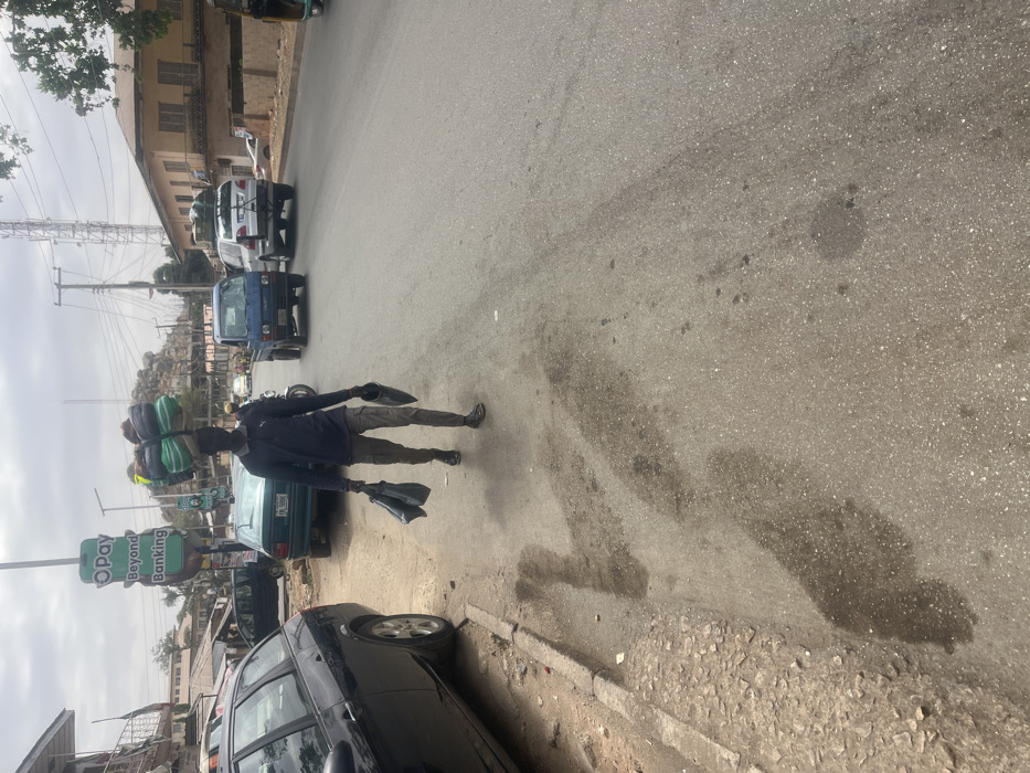 This image depicts an urban street scene in Jos, Nigeria, under an overcast sky