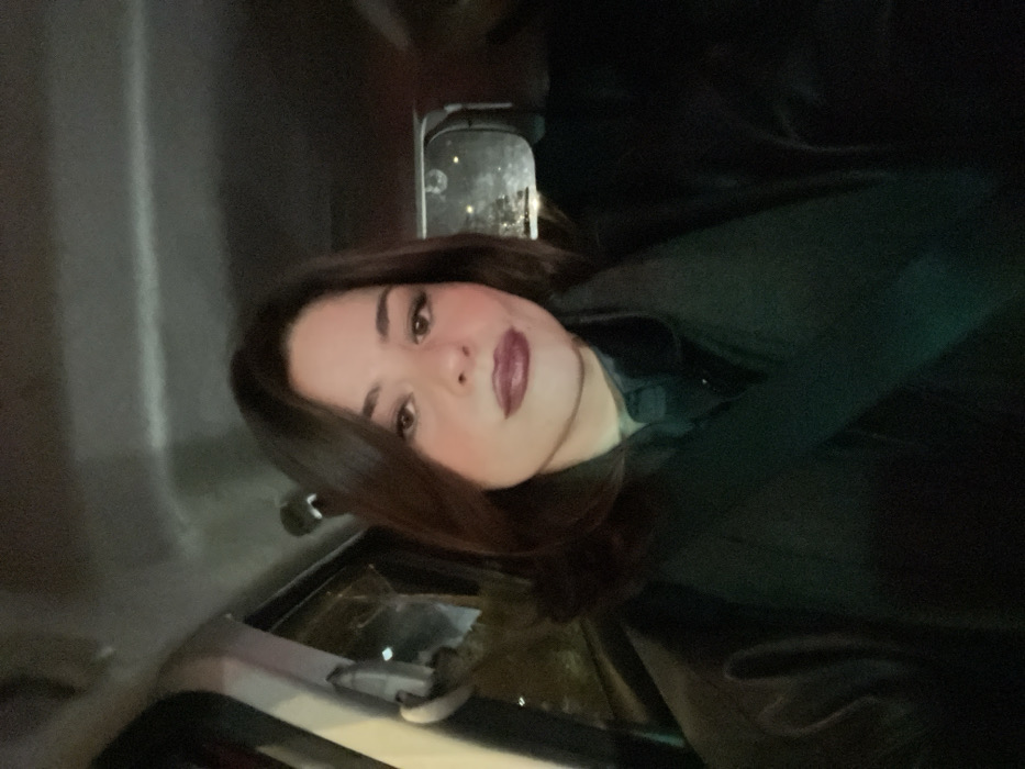 A woman with brown hair and dark lipstick is captured indoors, likely in a vehicle. She wears a dark shirt or jacket. Her complexion is fair with a hint of blush. The setting is somewhat dim, with light reflecting off the interior of the vehicle and creating indistinct shapes in the background, potentially visible through the car window. The photo's angle is slightly tilted, and the focus is on the woman's face.