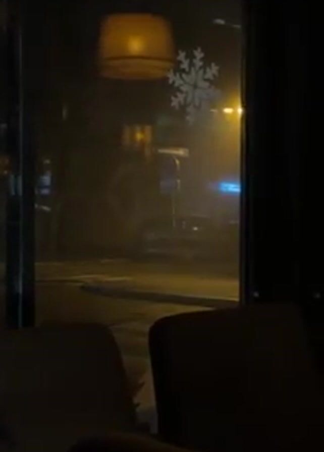 From the perspective of someone sitting at a table inside a cafe, a nighttime view of a city street on a foggy night is visible through a large window. Snowflake decals and an outline of Santa Claus are on the glass. A street light glows in the fog. Several cars pass on the street.