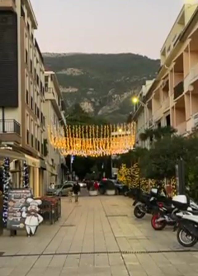 The video presents a daytime view of a pedestrian street decorated with Christmas lights in a town. The street is flanked by buildings of similar height with shops and apartments. A mountain is visible at the end of the street. The street is paved with rectangular tiles. Overhead, strands of illuminated bulbs create a canopy of light. Christmas trees adorn the sides of the street. Two motorbikes are parked on the right side of the street. A few people are walking in the distance. On the left side of the street, tables and chairs are set out for a restaurant. A cartoon chef cutout stands beside a menu board.