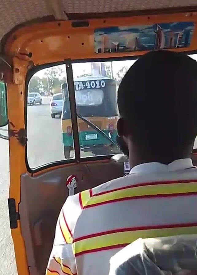 view from inside a three-wheeled vehicle, possibly a tuk-tuk or auto-rickshaw. The person filming is likely a passenger, as the back of the driver's head and upper body are visible. The driver is wearing a white shirt with yellow and red horizontal stripes. Through the front window, another similar vehicle can be seen directly ahead, with the text "PTA-40" and other illegible characters on its rear. Other cars are visible on the road, and the environment suggests an urban or suburban setting with trees visible in the background. The scene appears to be captured during the daytime, with sufficient light.