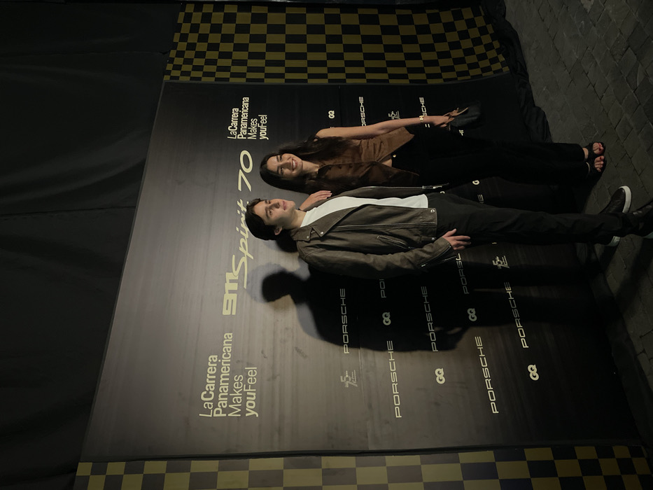 The image displays two young adults, one male and one female, posing in front of a dark promotional backdrop at an event, likely in Mexico City, Mexico. The backdrop features "La Carrera Panamericana Makes youFeel," "911 Spirit 70," and repeated "PORSCHE" and "GQ" logos in a lighter tone. A "75 Aniversario" logo is also visible. Yellow and dark checkerboard patterns flank the main branding area. The male, positioned on the left, wears a white t-shirt, a dark grey leather jacket, dark pants, and dark sneakers. He has dark hair and looks towards the right. The female, standing to the right and slightly behind the male, has long dark hair and wears a brown sleeveless vest, dark pants, and dark open-toed sandals, revealing red nail polish. She holds a small dark clutch bag in her right hand and rests her left hand on the male's right shoulder. Both individuals are smiling faintly and looking towards the right. Prominent dark shadows of the subjects are cast on the backdrop due to direct frontal lighting. The ground is dark, composed of paving stones or cobblestones. Above the backdrop, a dark fabric structure, possibly a tent ceiling, is visible. The presence of "La Carrera Panamericana" branding indicates a Mexican setting.