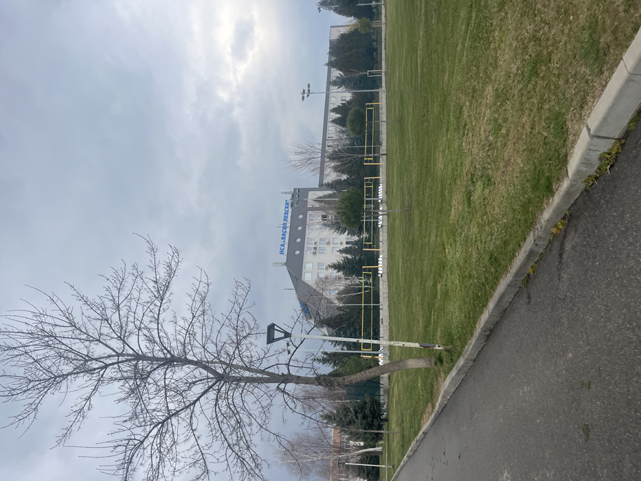 The image presents an exterior view of the National Sports Academy "Vasil Levski" (НСА „ВАСИЛ ЛЕВСКИ“) in Studentski grad, Sofia, Bulgaria, observed on an overcast day. In the foreground on the left, an asphalt pathway with a concrete curb borders a large green grassy field. A tall, bare deciduous tree with numerous fine branches stands to the right of the pathway, next to a modern street lamp topped with a solar panel. Across the grassy field, several yellow-painted metal frames with white nets, consistent with volleyball courts, are visible. Additional smaller trees, both coniferous and deciduous, are scattered around the field and behind these structures. The background features the main building of the National Sports Academy. It is a multi-story structure with a distinctive dark grey, sloped roof and light-colored facades containing multiple windows. The institution's name, "НСА „ВАСИЛ ЛЕВСКИ“", is prominently displayed in blue illuminated letters on the roofline. Various antennas and roof structures are also present. The building is partially surrounded by a line of trees, including conifers. The sky is uniformly light grey and overcast. No individuals are visible in the scene.