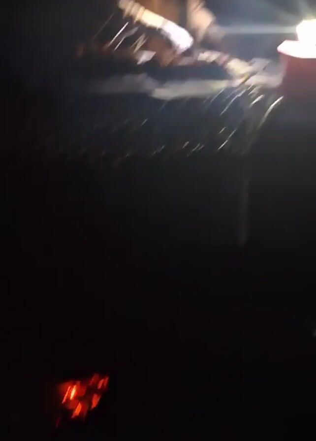 person working at night by the light of a lantern. The person is standing behind a table and appears to be skewering meat on sticks. The table is covered with a metal grate. There is a red container on the table, and some foil to the left. The background is dark. There is audio of an announcer speaking.