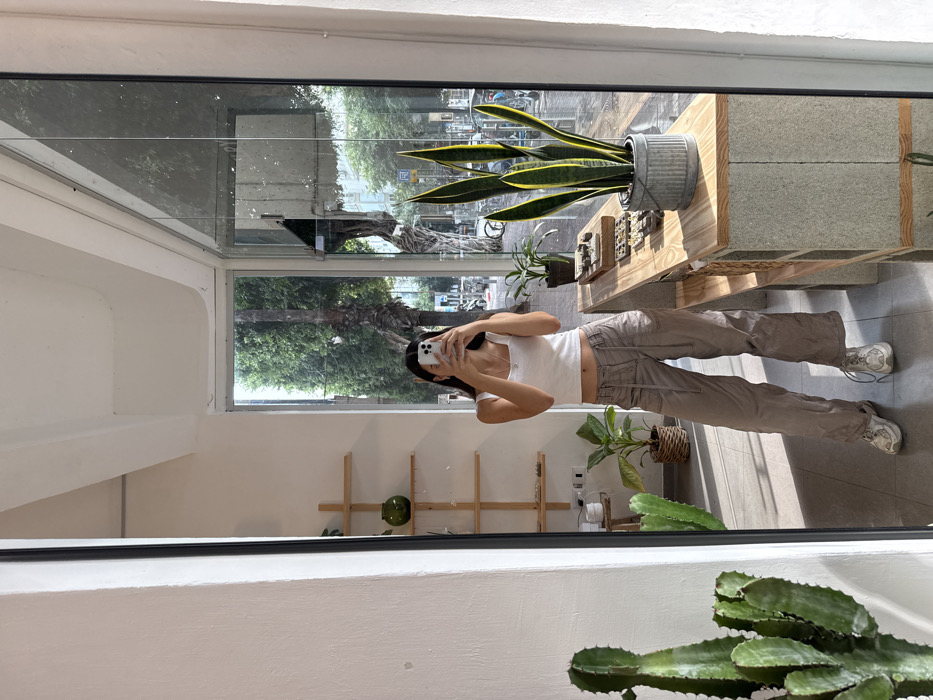 A young female, reflected in a large rectangular mirror with a black frame, stands indoors taking a selfie with a light-colored smartphone that obscures her face. She wears a white square-neck crop top, tan cargo pants, and white athletic shoes. Her long dark hair hangs down. The interior features white walls and ceiling, a light grey floor, and several plants including a large cactus to the left, a potted snake plant in a corrugated metal pot on a counter to the right, and another potted plant in a woven basket behind her. On the back wall, three light-wood shelves display minimalist items, including a dark green spherical vase. A long wooden display counter, constructed on grey block bases, holds multiple trays containing small objects, possibly jewelry. A large window behind the female provides a view of an urban street with tall green trees, distant buildings, and what appears to be a parked blue bicycle. The scene is brightly lit by natural sunlight, casting shadows on the floor. The location is in the city of Unknown, Unknown.