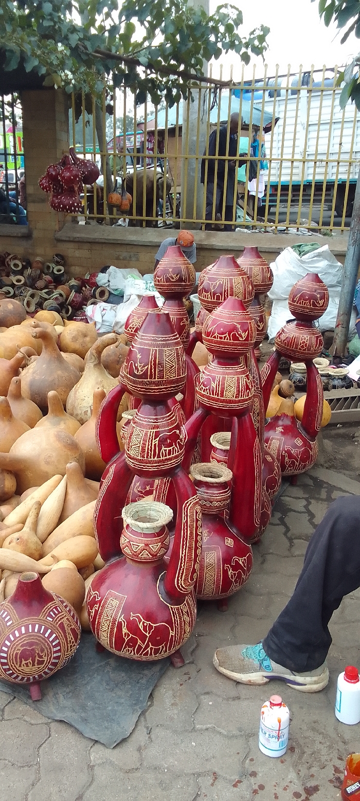 An outdoor market stall is depicted on a paved surface in an Unknown, Unknown city location. The ground is composed of grey interlocking paver blocks, with a dark, irregular mat placed on it at the lower left. In the foreground, a large assortment of dried, unadorned gourds of varying shapes and sizes, predominantly light brown, occupies the left side. To the right of these, a prominent display of numerous deep reddish-brown gourds, meticulously carved with intricate light-colored geometric patterns and animal motifs, is arranged. These crafted gourds are stacked and grouped, with some appearing as multi-tiered decorative vessels, others resembling teapots with handles and spouts. Identifiable animal motifs include elephants, giraffes, and camels. Some of the crafted items feature woven raffia rims. A partial view of a person's lower right leg and foot is visible at the bottom right. The individual wears black pants and beige athletic shoes with a turquoise accent. Adjacent to this foot are two white plastic bottles on the ground: one is labeled "PEPPER SPRAY" and exhibits red liquid drips on its side and top; the other is unlabeled with a red cap. Reddish liquid stains are present on the pavers around the bottles. In the mid-background, behind the gourd display, a male figure wearing a grey t-shirt and an orange baseball cap is seen bending forward, partially obscured by some white sacks and more gourds. Further back, a yellow metal fence with vertical bars runs horizontally across the mid-ground. Behind this fence, several individuals are visible. To the left, a person in a blue shirt is partially seen. Towards the center-right, a bald male figure in dark clothing stands, facing right, partially obscured by the fence. A large white truck is visible behind the fence on the right. Overhead, green foliage from trees or bushes is present in the upper left corner.