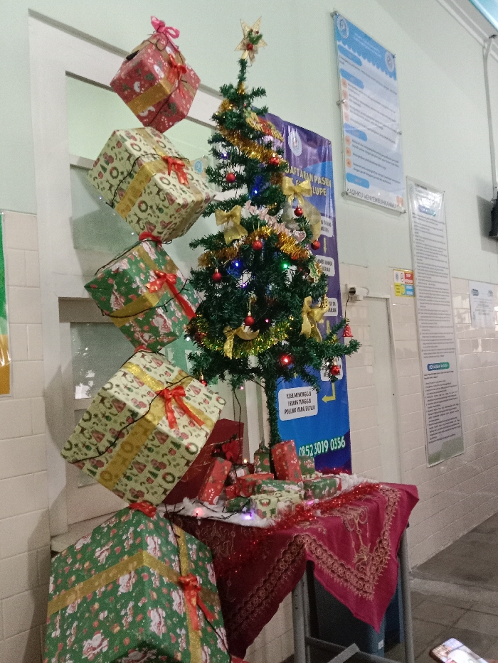 The image depicts an indoor scene within a healthcare facility in Madiun, Indonesia, likely a clinic or hospital waiting area or corridor, decorated for Christmas