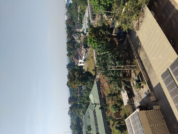 This image depicts an aerial view of an urban or suburban area in Shaba, Nigeria, under a clear, pale blue sky. In the immediate foreground, a light-colored building with a flat roof is visible on the left, topped with two rectangular arrays of dark solar photovoltaic panels. Adjacent to this, extending across the lower right, is a light-colored corrugated metal roof providing shelter; a dark two-wheeled vehicle (possibly a motorcycle or scooter) is partially discernible underneath. The midground features a paved or concrete surface bordered by a low concrete wall. Beyond this wall, the terrain becomes heavily vegetated with numerous green trees and shrubs, interspersed with patches of dry, overgrown land. Several utility poles with overhead lines are present within this area. A multi-story white building with a distinctive brown pitched roof stands out among the trees in the center-right midground. To the left midground, a complex of buildings with light green corrugated metal roofs and light-colored walls is situated. The background shows a distant urban landscape characterized by a mix of buildings and extensive tree cover, extending towards a hazy horizon. No individuals or discernible human activity are present in the visible scene.