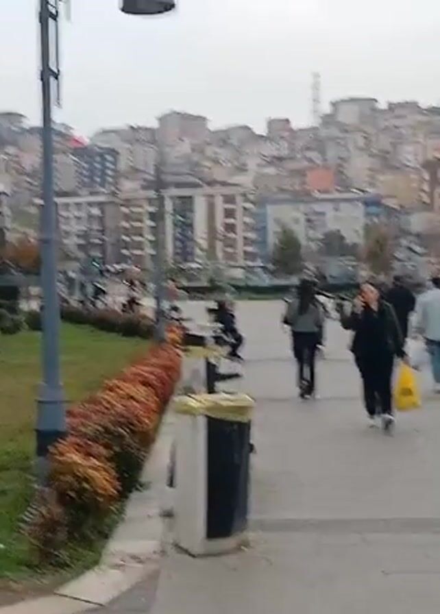 public area in a city, likely Istanbul, Turkey, with a modern train station on the left