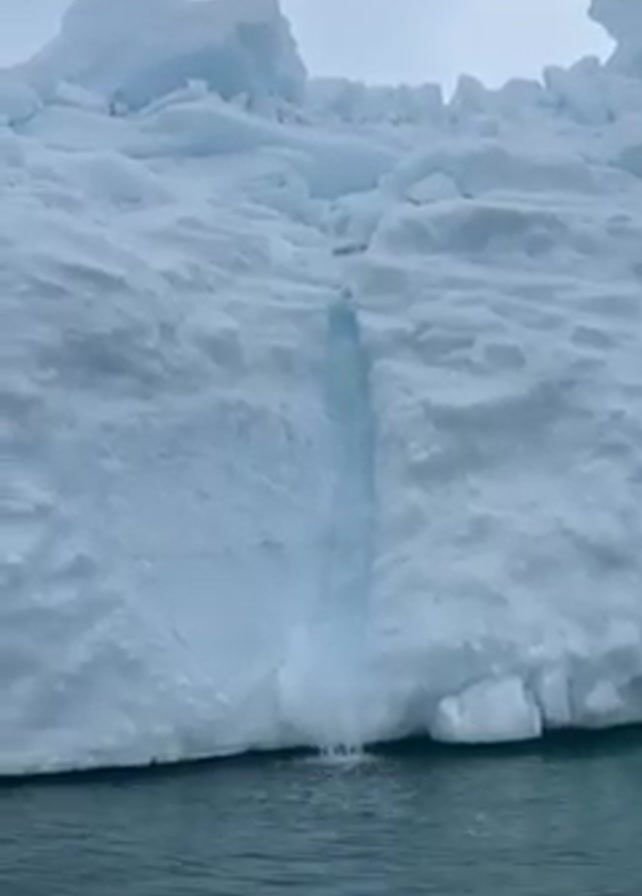 large iceberg with a waterfall flowing down its side, emptying into the surrounding water