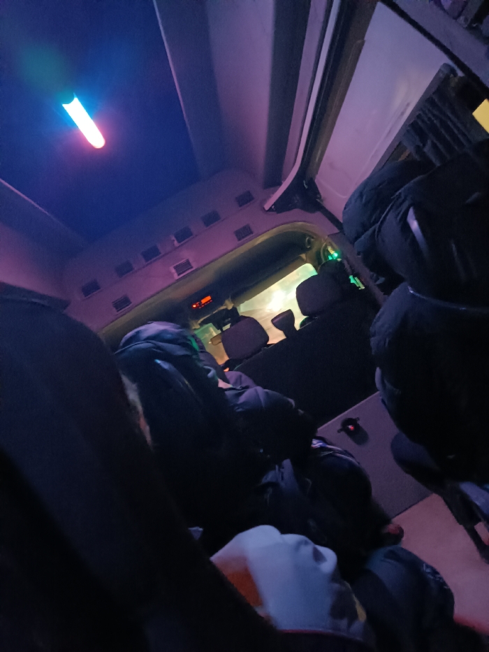 Inside a dimly lit van, figures clad in dark winter jackets are seated. Overhead, a colorful light casts blue, green, and red hues across the ceiling. A digital display is visible near the front of the van, while bright daylight shines through the front windshield. The close-up perspective focuses on the passengers and the interior of the van.