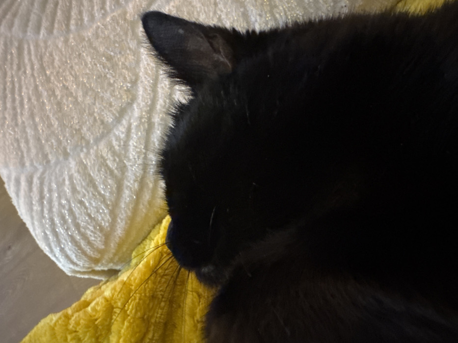 A black cat rests against a white, textured cushion. The cat's head is turned away, displaying one ear. Yellow fabric is draped below the cat, adding a splash of color. The scene is softly lit, enhancing the textures of the cushion and the cat's fur. The composition is intimate, focusing on the serene moment of repose.