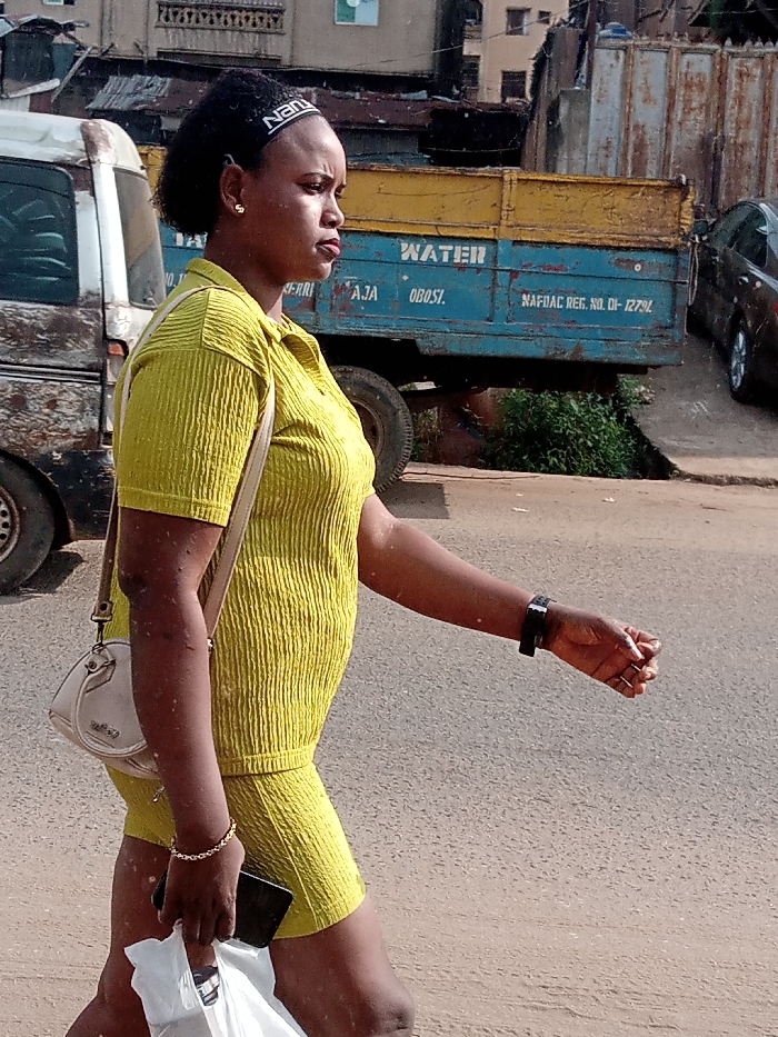 A woman, appearing to be of African descent, is depicted walking from left to right across a paved surface in the city of Unknown, Unknown