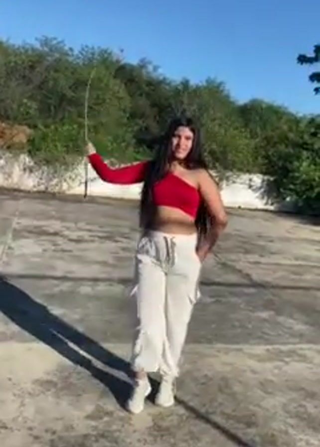 A young woman dances on a concrete surface outdoors in bright sunlight, against a backdrop of green trees and a clear blue sky. She is wearing a red one-shoulder crop top and loose-fitting white pants, with white sneakers. She holds a thin tree branch in her hand, which she waves around as she dances. The camera angle changes slightly throughout the video, and the camera occasionally rotates to show her from different perspectives. She smiles and poses while dancing.