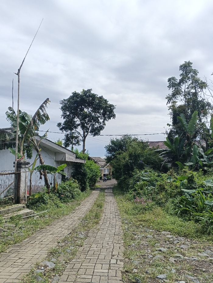 A brick road leads through lush greenery and toward distant houses under an overcast sky. Tall trees dot the landscape, with a prominent tree in the center. Vegetation, including banana plants, thrives along the road's edges, encroaching onto the brick surface. Structures with simple designs flank the path, blending with the natural environment. The scene evokes a rural, tranquil atmosphere.