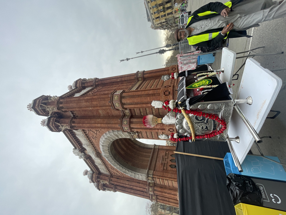 The image depicts an outdoor urban scene in Barcelona, Spain, dominated by the red brick Arc de Triomf in the background under an overcast sky. In the foreground, a highly ornate, polished silver ceremonial structure, adorned with red rose garlands, black fabric banners featuring green and white calligraphy, and topped with a red and white feathered finial, is displayed on two white rectangular collapsible tables. To the left, a black fabric barrier is positioned near yellow and blue recycling bins. To the right of the tables, an adult male with a beard, wearing a brown flat cap, a light-colored long shirt, light trousers, a dark jacket, and a bright yellow high-visibility vest, stands, his left hand slightly raised. In the mid-ground, decorative streetlights and multi-story city buildings are visible along a paved street.
