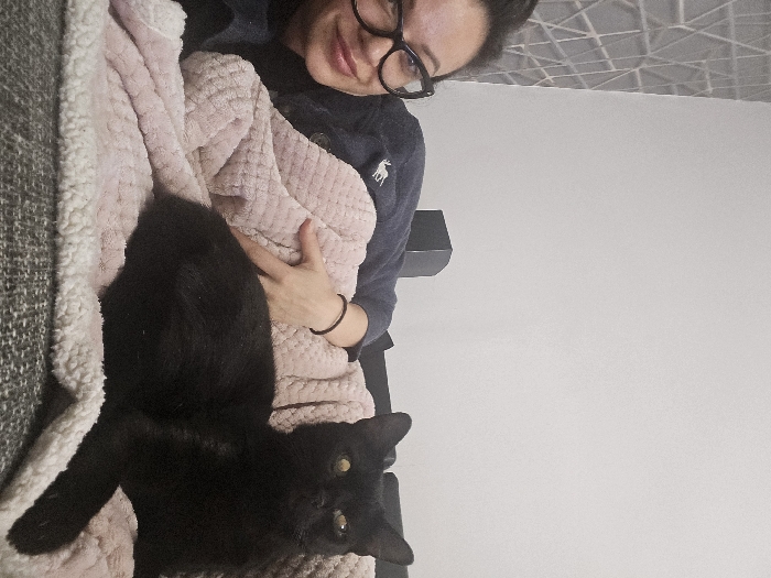 An indoor scene in Sofia, Bulgaria, features one adult female and one black domestic cat. The female, visible from the chest up on the left, wears dark-rimmed eyeglasses and a dark blue garment. Her left hand, adorned with a black elastic band on the wrist, rests on a textured pink blanket with white, fluffy trim. The black cat is positioned centrally to the right of the female, lying on the same blanket and facing the viewer. Its eyes are yellow-hued, with the right eye displaying a brighter reflection. Both subjects are in a resting posture on a gray, textured upholstered surface. The background consists of a light-colored wall, partially covered by geometric patterned wallpaper on the left, and includes a dark, angular electronic device visible in the mid-background.