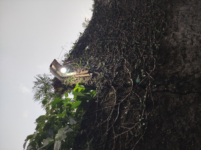 This image depicts a section of a weathered wall in Kassel, Germany, under an overcast sky. The lower visible portion of the wall is dark, textured, and exhibits a prominent vertical crack running through its surface from the bottom-left. The upper section of the wall is densely covered with entangled vegetation, primarily consisting of numerous bare, woody vine branches mixed with small green leaves. A metallic light fixture, appearing weathered and possibly rusted, is centrally mounted within the upper half of the frame, emitting a bright white light from a single bulb. Yellow-colored electrical wires are visible adjacent to the fixture, partially obscured by the foliage. To the upper left, large, broad green leaves of a different plant type are visible, while behind and to the right of the light, a plant with distinct palm-like fronds is present. The sky above is uniformly bright and grey, indicative of overcast conditions. No individuals or animals are visible in the scene.