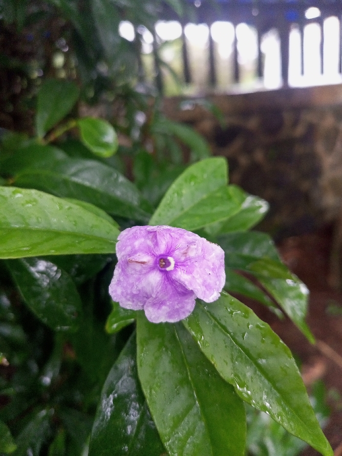 A single light purple flower, exhibiting five distinct petals and a darker purple center with visible light brown stamens, is depicted prominently. The flower and its surrounding dark green, ovate leaves are covered with numerous water droplets. The background is out of focus, revealing blurred green foliage on the left and a combination of a dark, indistinct surface and a bright, segmented horizontal structure on the right. No individuals or animals are present. The scene is located in the city of Beni, Nepal.