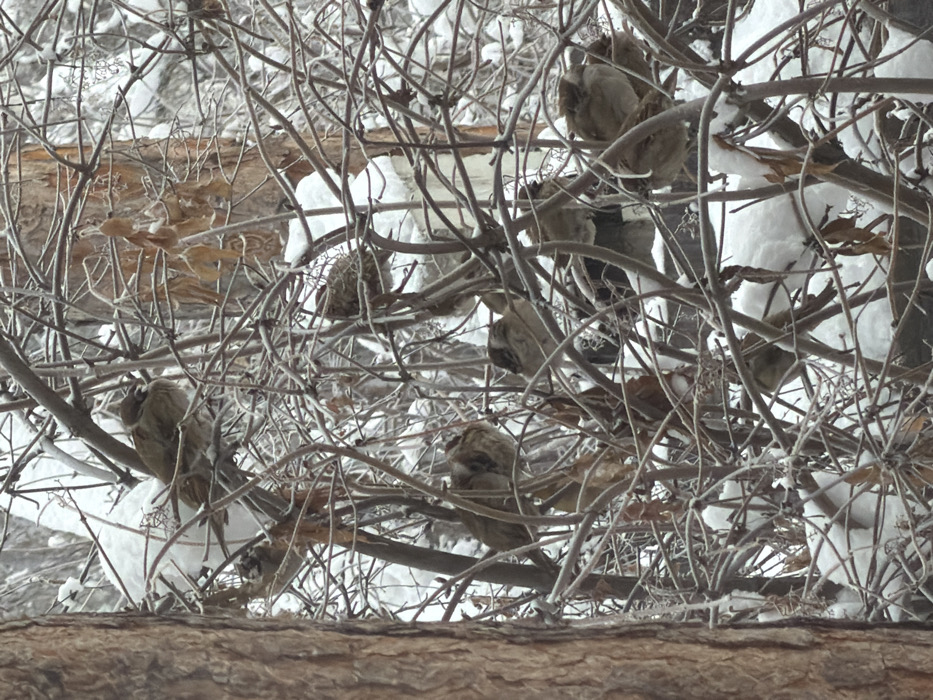 - "Several small, brown birds perch amongst snow-covered branches and logs" by FM-BcGYc2, licensed under CC BY 4.0